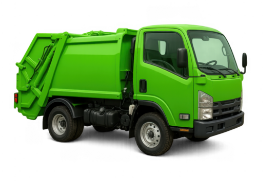 A clean, modern bright green garbage truck rendered on a transparent background, perfect for waste management and municipal service illustrations. background removed