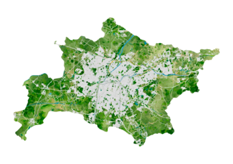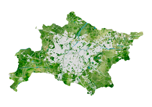 Detailed urban map with lush green landscape and road network on transparent background, PNG