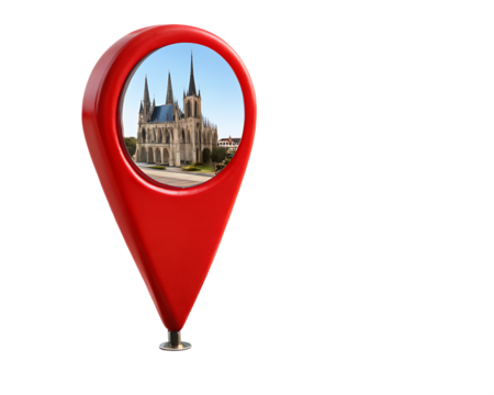 Red location pin with cathedral isolated on transparent background