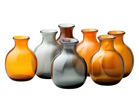 Vibrant handcrafted Murano glass vases in amber and gray on white background from Venice Italy