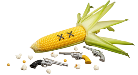 Conceptual image of a dead ear of corn killed by revolvers surrounded by popcorn kernels. isolated PNG with Transparent Background