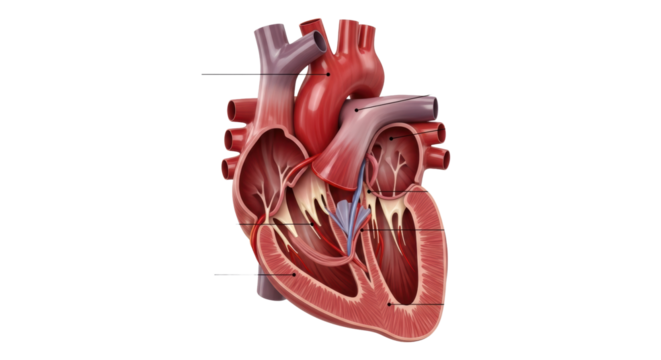 Three-dimensional, clinically accurate sagittal cross-section of a human heart, detailed valves and ventricles in crimson hues, labeled with japanese kanji on white, concept of medical schematic