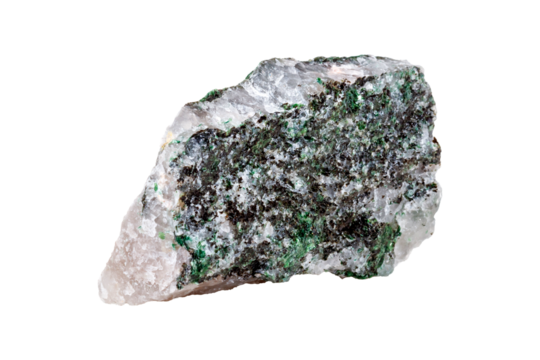 close up of sample of natural stone from geological collection - raw albite mineral with muscovite isolated on white background from North Karelia