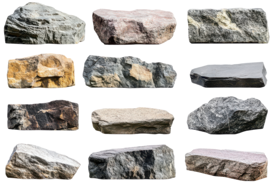 Collection of rough natural stone rocks isolated on transparent background. Collection set of flat rocks stone podium for display product isolated on white background.