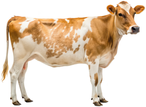 A realistically rendered, brown and white speckled dairy cow with a gentle expression stands calmly in a side profile view, showcasing its muscular build and, isolated on transparent background.