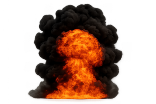 Fiery nuclear explosion mushroom cloud isolated on transparent background
