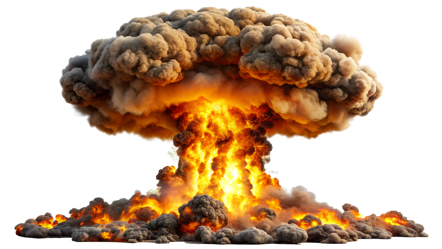 A massive mushroom cloud explosion with intense fire and smoke, representing a nuclear blast or powerful detonation, isolated on transparent background