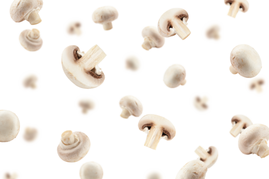 Champignon, mushroom, falling, isolated on white background, full depth of field