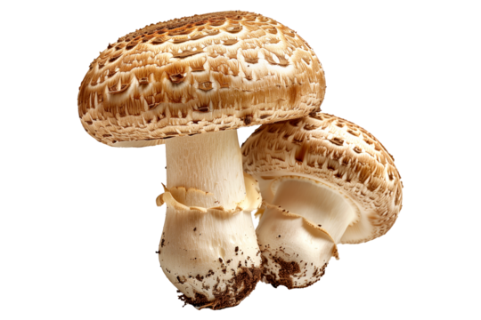 Closeup of White Button mushroom showing its textured cap and stem isolated on a white background. Concept of fungi and nature