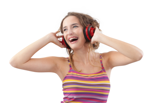 Close up of excited brunette woman with happy toothy smile in headphones listening music enjoying a new day, happy leisure time during vacations against transparent background. Pretty student