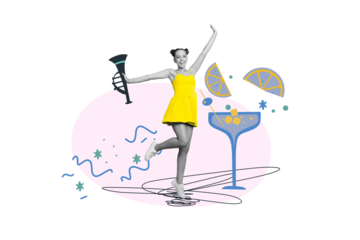 Composite trend artwork sketch image photo collage of party celebrate drink cocktail glass event young lady dance hold musician tube