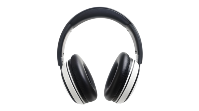Black and white overear wireless headphone with thick earcups, isolated on transparent background for clear product display and audio concept