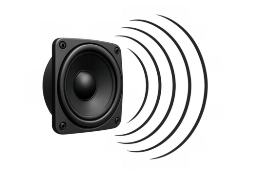 Black speaker icon emitting sound waves, symbolizing audio, music, volume, and wireless communication on transparent background