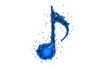 Red and blue 3d music notes, treble clef, and staff lines creating a flowing melody on transparent background