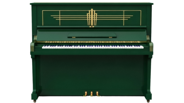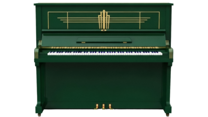 Isolated green upright piano with vintage gold-colored trim, musical instrument indoors