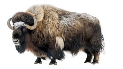 Majestic Musk Ox Portrait: A captivating view of a robust musk ox, showcasing its shaggy, thick coat and impressive, curved horns. This animal stands proudly, symbolizing strength and resilience.