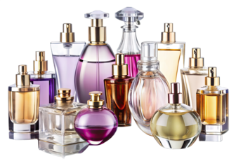 A close-up image of various perfume bottles, showcasing a variety of colors, shapes, and sizes, with a clean, white backdrop