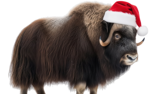 Festive Musk Ox wearing a red Santa hat for Christmas isolated PNG with Transparent Background