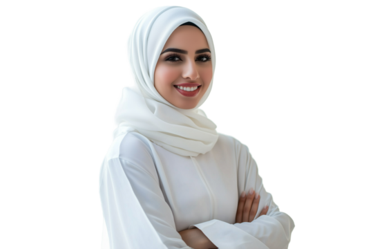 Portrait of happy indian muslim woman wearing hijab standing cross arms isolated against transparent png background