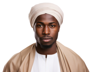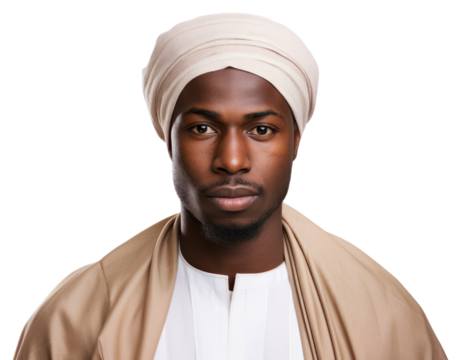 A muslim man in traditional dress is depicted in a religious pose of prayer and devotion to god isolated on transparent background