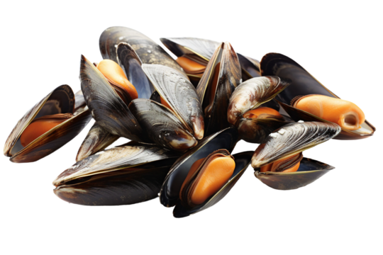 Fresh black mussels isolated on a transparent background, showcasing their rich color and gleaming shells, perfect for seafood dishes and culinary presentations