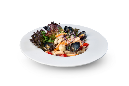 Seafood salad with mussels on a white plate