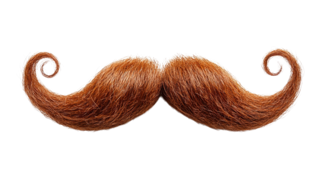 A vibrant ginger mustache with curled ends isolated on a black background for design elements use