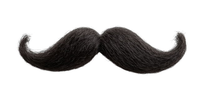 Classic black handlebar mustache with a textured appearance. Ideal for retro themes, vintage styles, character designs, and facial hair concepts against or on transparent PNG background.