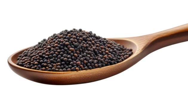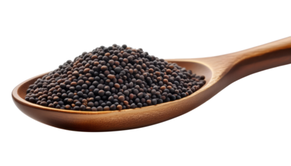 Close-up of Organic Black mustard seed in spoon on transparent background