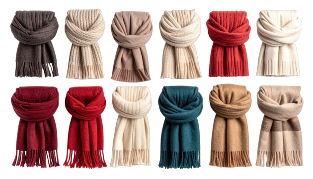 Assortment of folded and fringed scarves displayed in various muted colors