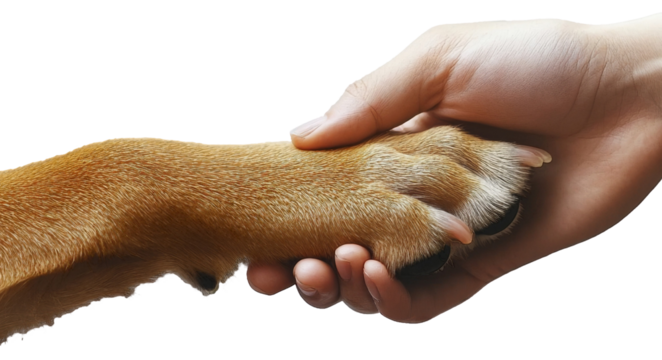 Human hand holding brown dog's paw close-up, friendship and trust concept