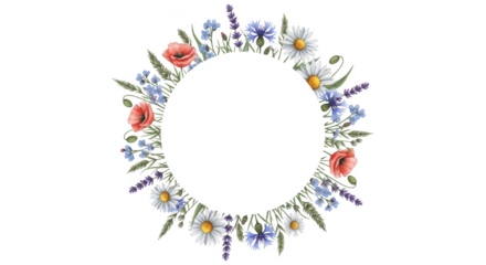 Round floral wreath with poppies daisies cornflowers and lavender on black background round frame