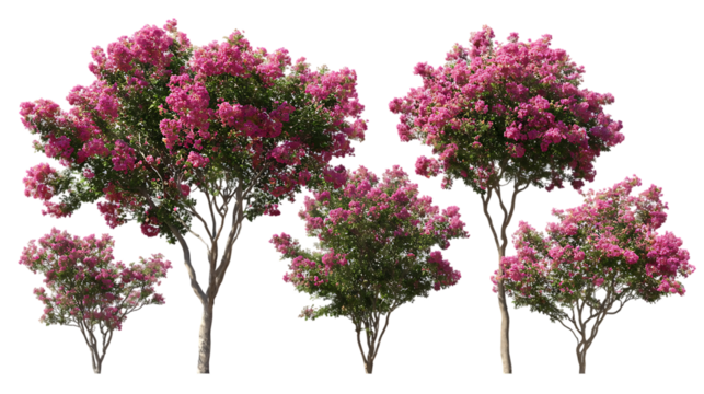 Collection of crape myrtle trees in various sizes, isolated on transparent background.