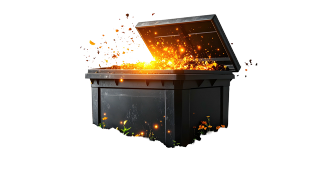 A treasure chest, open, emitting radiant orange light and particles, on a black background