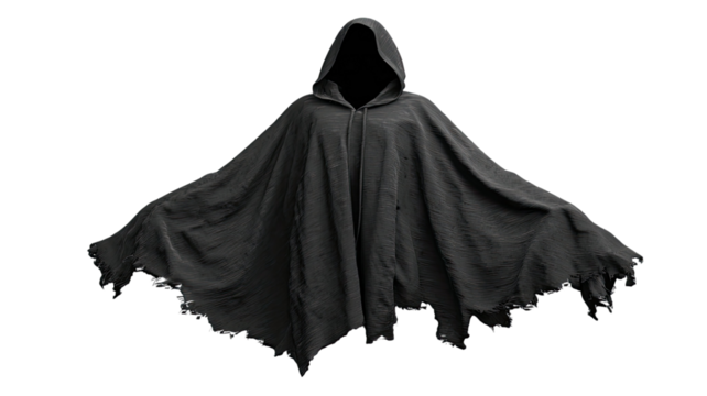Floating empty black hooded cloak with dark mysterious appearance creating a fantasy horror costume illustration isolated on white background