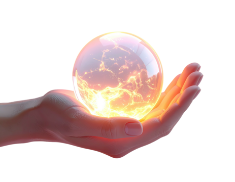 A translucent, glowing orb, filled with swirling light, is held gently in a cupped hand