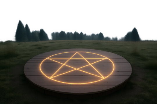 Bright glowing pentagram on circular wooden stage in grassy field, deck with magic symbol and transparent background