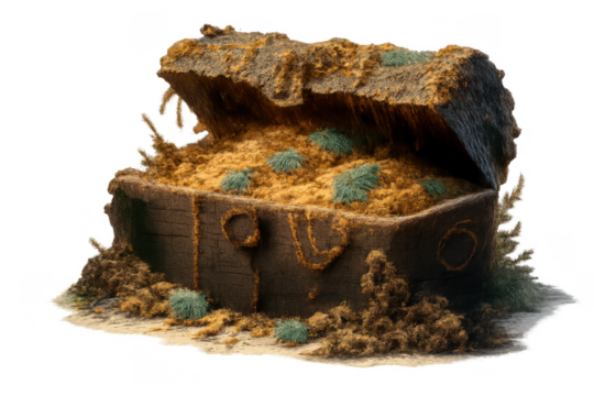 Ancient treasure chest opening, revealing golden contents, old wooden chest covered in moss and seaweed, lost pirate bounty