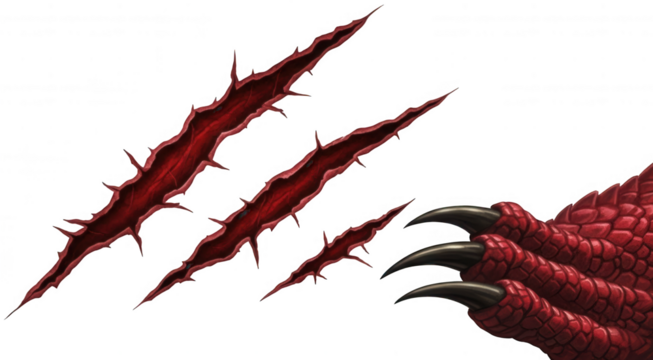 Red dragon paw and jagged bloody claw marks, aggressive creature limb and injury symbols