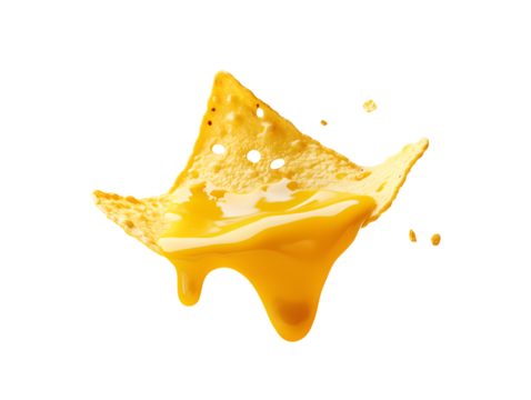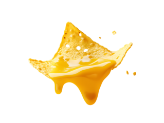 Single crispy yellow nacho chip dripping with rich golden cheese sauce and splashes isolate