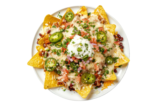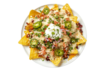 cheese nachos with toppings such as beans, jalapeno and sour cream, on a white plate