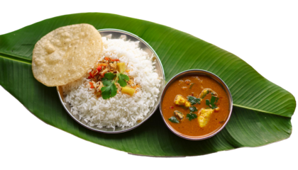 Tamil Nadu Style Meals with Rice, Rasam, and Appalam on Banana Leaf, Transparent Background