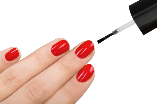 Beautiful manicure process. Nail polish being applied to hand, polish is a red color. White background closeup.