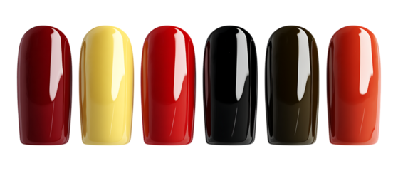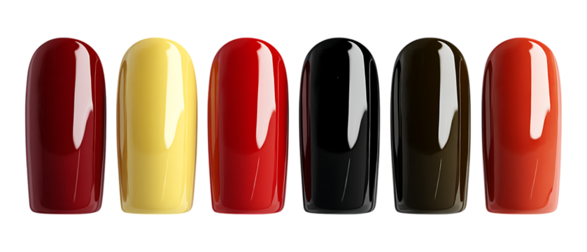 Three almond shaped gel nail polish swatches isolated on transparent background