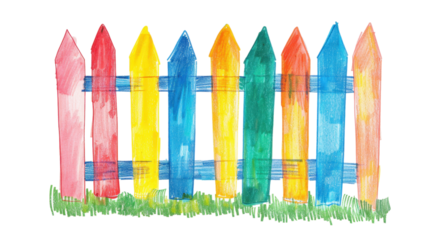 Childlike Crayon Drawing of Colorful Picket Fence with Green Grass