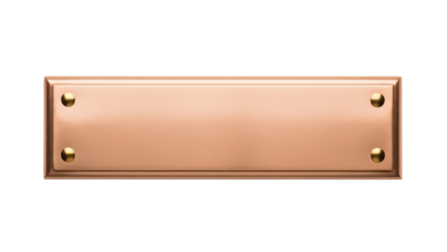 Blank copper metal plate isolated PNG, name tag with rivets for signage and labeling on transparent background