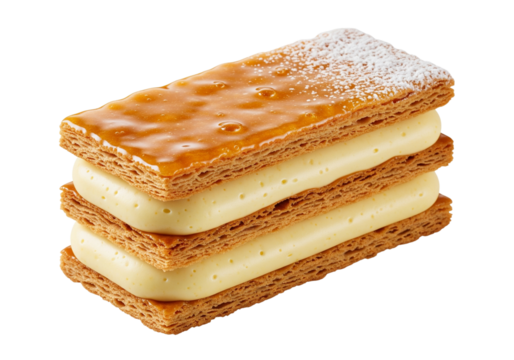 Exquisitely crafted napoleon pastry (mille-feuille) with flaky layers, vanilla cream, white marbled chocolate fondant, on seamless transparent background with bokeh, professional food photography