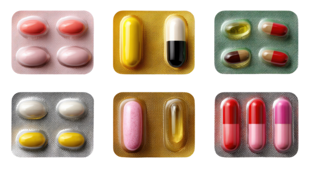 Medical Assortment: A vibrant selection of pills and capsules, neatly arranged in blister packs, offering a visual narrative of health and wellness, ready for consumption.