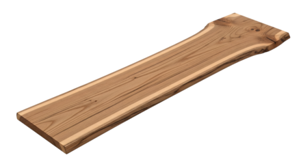 A long, narrow, liveedge wooden board with visible grain, isolated on a transparent background