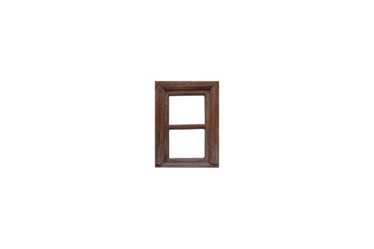 Small dark wooden window frame with two openings is isolated.
